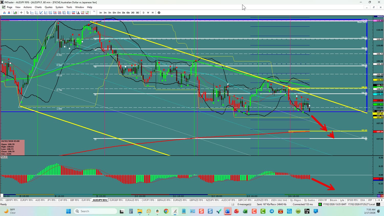 Forex Strategy is Bearish: We are currently @ 107.89 in the bottom of a range. If we can break here, we are looking for a continuation to the ATR Target @ 107.25 area. The overall target is the S5 @ 107.00 area. We have convergence on the hourly. USDX is currently up. Watch the USDX for direction. The average daily true range (ATR) for the pair currently is 138 pips per day and it’s 90-day average is 98 pips per day.