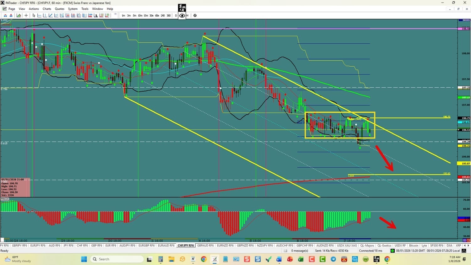 Forex Strategy is Bearish: We are currently @ 196.52 in a rectangle pattern and a channel. If we can break support here, we are looking for a continuation to the ATR Target @ 195.65 area. A further Target is the 0.500 Fibo @ 195.55. We have convergence on the hourly. USDX is currently up. Watch the USDX for direction. The average daily true range (ATR) for the pair currently is 111 pips per day and it’s 90-day average is 130 pips per day.