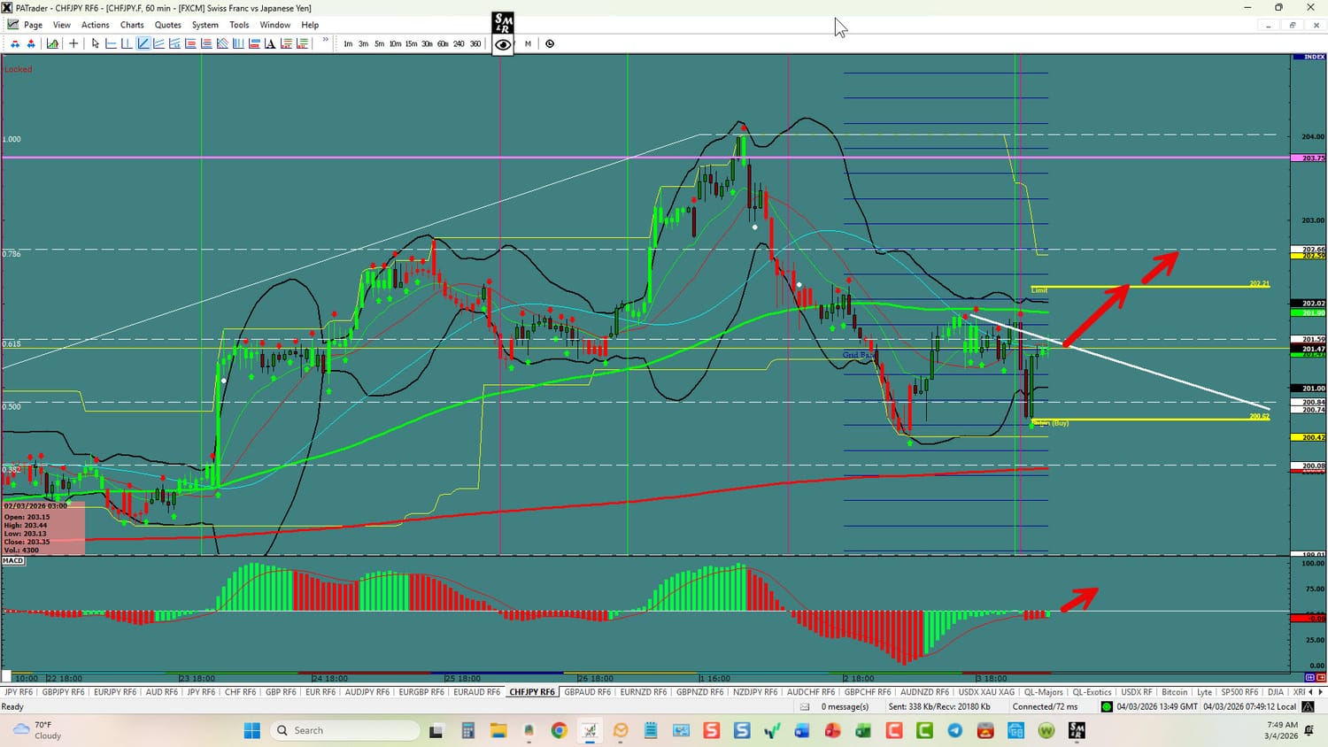 Forex Strategy is Bullish: We are currently @ 201.47. We are looking for a continuation to the ATR Target @ 202.21 area. The overall target today is the 0.786 Fibo @ 202.66 area. We have the start of convergence on the hourly. USDX is currently threatening down. Watch the USDX for direction. The average daily true range (ATR) for the pair currently is 157 pips per day and it’s 90-day average is 144 pips per day.