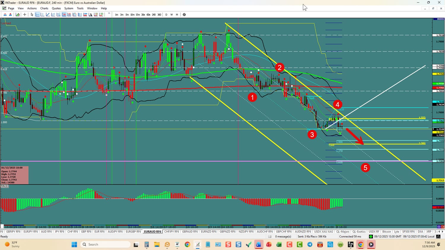 Forex Strategy is Bearish: We are currently @ 1.7529 in a 5th wave and a channel. We are looking for a continuation to the ATR Target @ 1.7465 area with a further target @ 1.7442. We have convergence on the hourly. USDX is currently up. Watch the USDX for direction. The average daily true range (ATR) for the pair currently is 101 pips per day and it’s 90-day average is 109 pips per day.