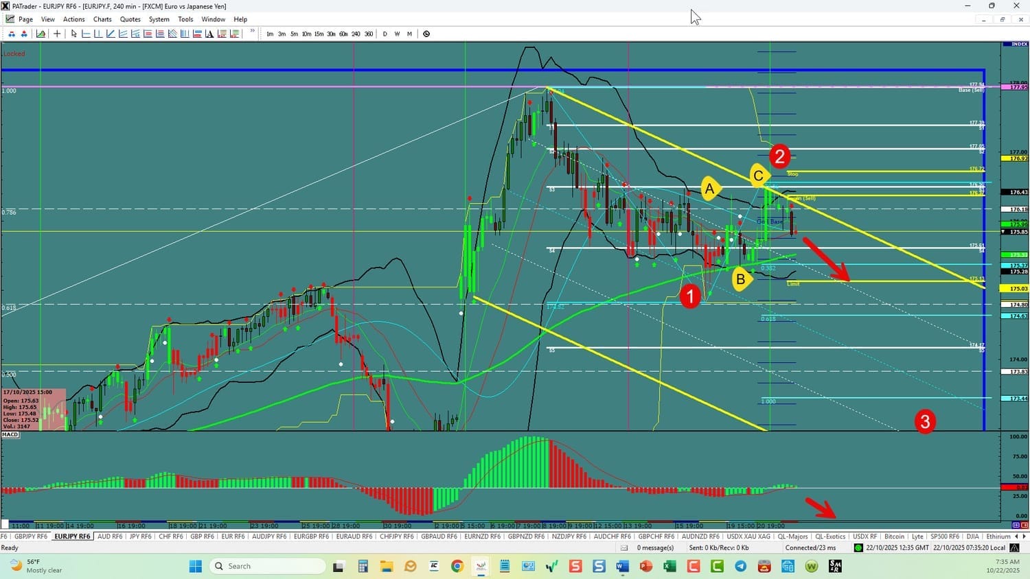 Forex Strategy Bearish: We are currently @ 175.85 in a channel and a possible 3rd wave starting. If we can break slope support here, we are looking for a continuation to the ATR Target @ 175.13 area with a further target the 0.618 Fibo @ 174.63. USDX is currently UP – if it flips this probably won’t happen. Watch the USDX for direction. The average daily true range (ATR) for the pair currently is 124 pips per day and it’s 90-day average is 108 pips per day.