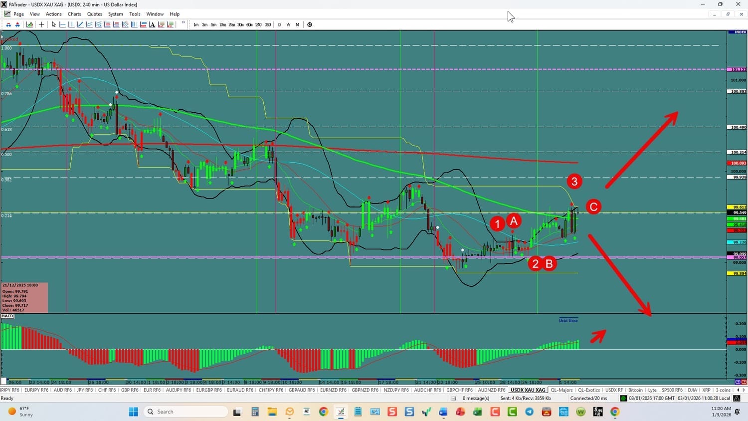 USDX: Forex Strategies Waiting: Currently, we are in a possible c wave (Short) or a 3 wave (Long). We have convergence on the hourlies for the long. The pairs should prove it out when the market opens. All of this could change in a heartbeat and will affect the currencies below. ATR’s are about the same as last week – but should rise after the holiday period. BE SMART - TRADE WITH STOPS!!!!