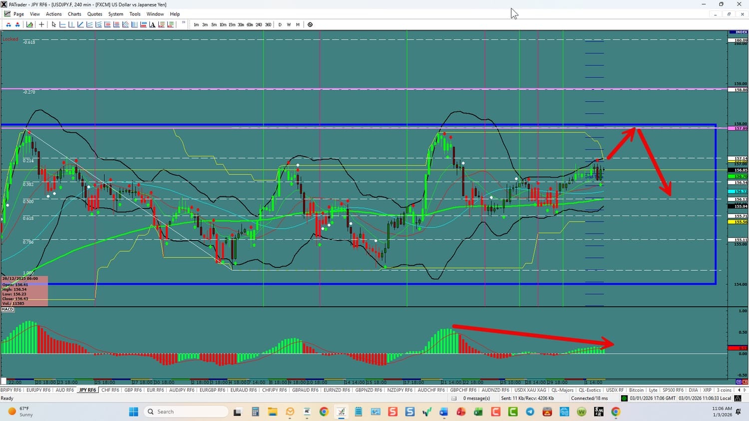 Forex Strategies Bullish to Bearish: We are currently @ 156.85 at equilibrium of the range. We are looking to continue to the range top @157.89 area. We have divergence in play on the hourlies. Expect a selloff at the top. The average daily true range (ATR) for the pair 80 pips and it 90-day average is 95 pips.