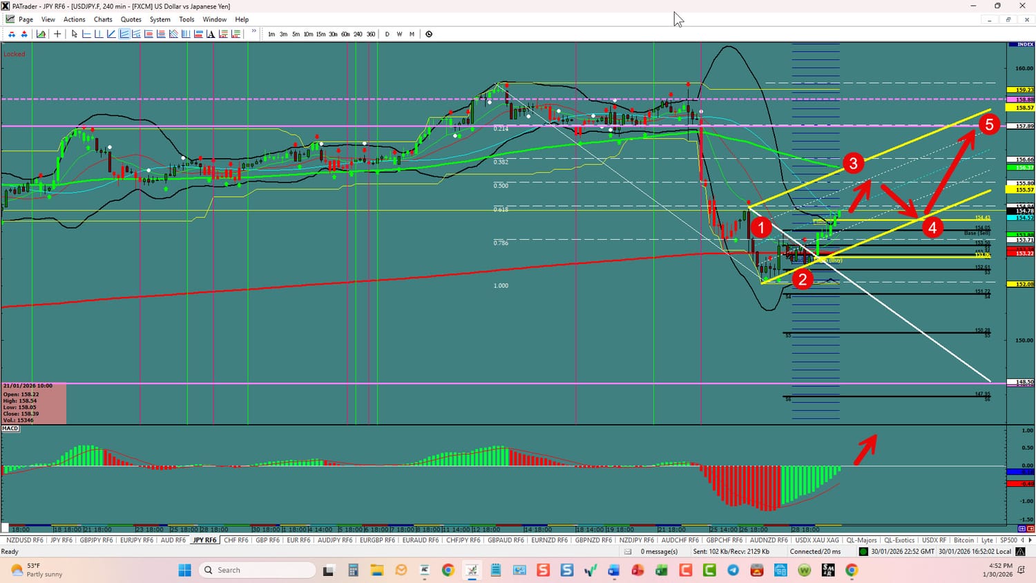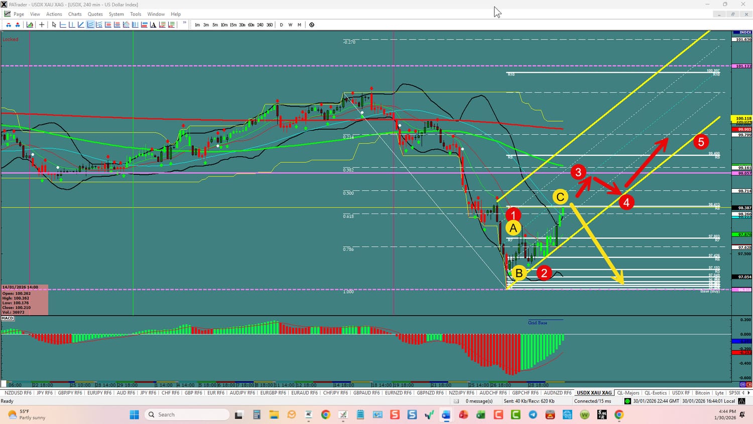 USDX: Forex Strategies Bearish: Currently, we are in a possible ABC or 3rd wave up. We have convergence on the hourlies for the long. Watch for either scenarios and adjust accordingly. The pairs should prove it out when the market opens. All of this could change in a heartbeat and will affect the currencies below. ATR’s are way up over last week. Gold and Silver took a hit ( probably temporary) with the up move on USDX. Below is based on USDX doing a 5 wave pattern. BE SMART - TRADE WITH STOPS!!!!