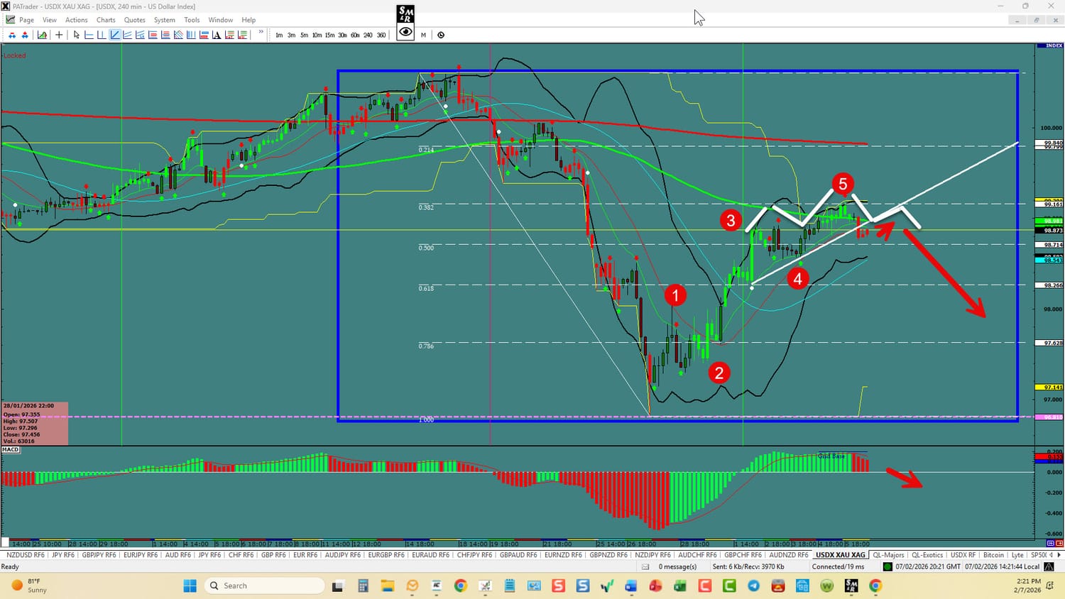 USDX: Forex Strategies Bearish: Currently, we are in a possible Head and shoulder pattern down. We have the start of convergence on the hourlies for the short. The pairs should prove it out when the market opens. All of this could change in a heartbeat and will affect the currencies below. ATR’s are up over last week. Gold and Silver took a hit ( probably temporary) with the up move on USDX. Below is based on USDX doing a H&S pattern. BE SMART - TRADE WITH STOPS!!!!