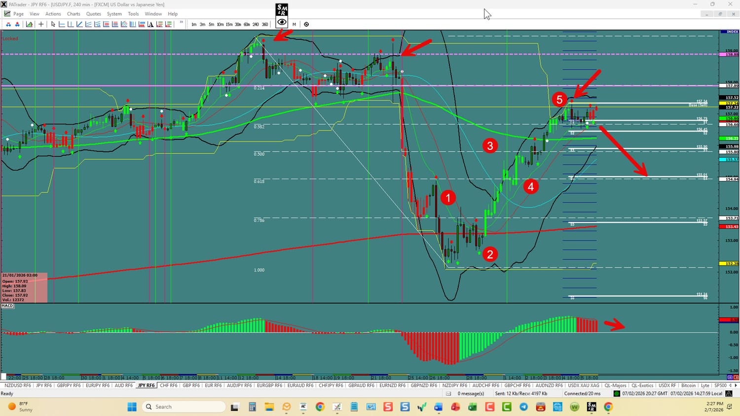 Forex Strategies Waiting: We are currently @ 157.22 after a 5th wave up. We are looking for a reversal (which takes time) and a continuation to the S4 @ 154.94 area. The average daily true range (ATR) for the pair 147 pips and it 90-day average is 97 pips.