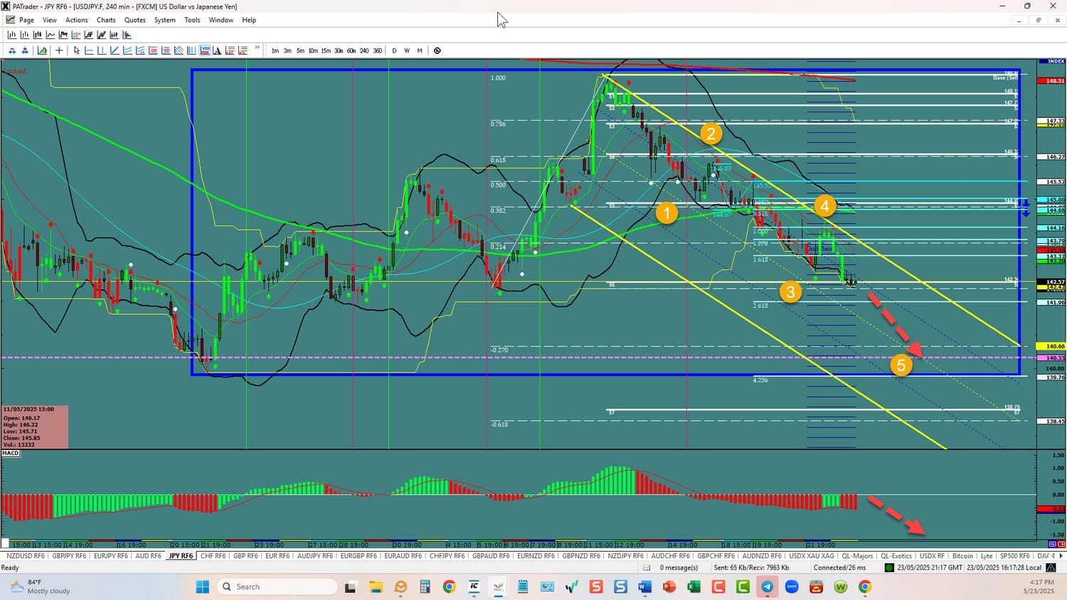 Forex Strategies Bullish: We are currently @ 142.57in a 5th wave. We are in a channel and we expect to continue to the Day chart support area @ 139.76 area. Watch the USDX for direction. The average daily true range (ATR) for the pair currently is 167 pips and it 90 day average is 165 pips.