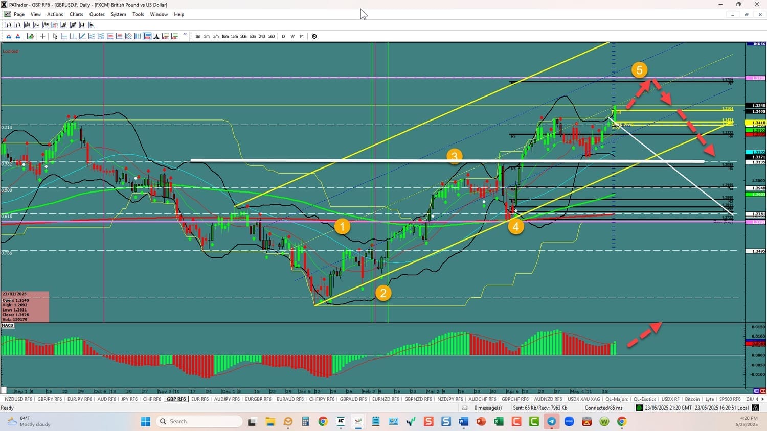Forex Strategies Bullish to Bearish: We are currently @ 1.3540 in a channel. We expect a move to the top @ 1.3738 and the a sell of back to equilibrium. Watch the USDX for direction. The average daily true range (ATR) for the pair 104 pips and it 90 day average is 102 pips.