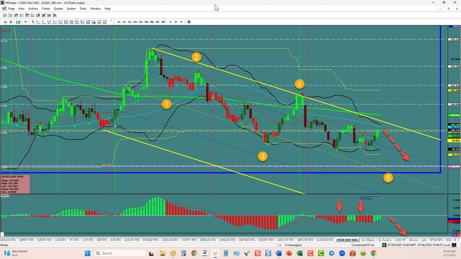 USDX: Forex Strategies Bullish back to bearish: Currently, it looks like still in a 5th wave– MACD still down. Wait for confirmation. The pairs should prove it out when the market opens. All of this could change in a heartbeat and will affect the currencies below. ATR’s are slightly lower than last week. BE SMART - TRADE WITH STOPS!!!!