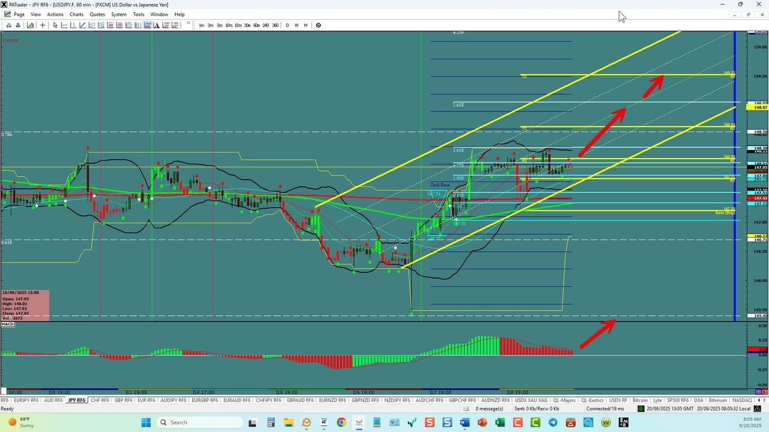 Forex Strategies Bullish: We are currently @ 147.95 in a channel. We are in a 3rd wave. We are looking to continue to the R4 @ 149.50. Watch the USDX for direction. The average daily true range (ATR) for the pair 118 pips and it 90 day average is 129 pips.