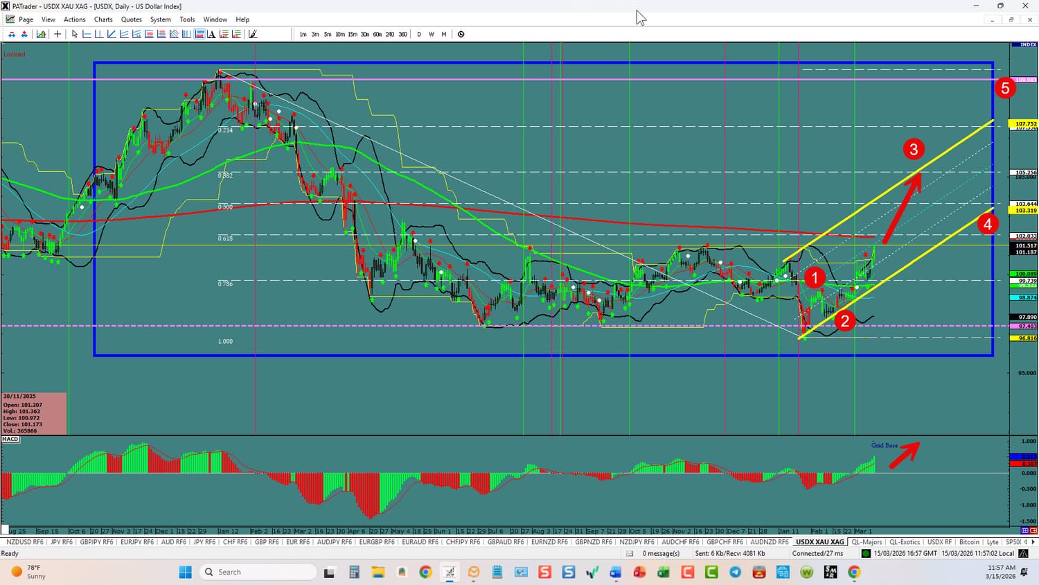 USDX: Forex Strategies Bullish: We are in a 3rd wave UP. We are looking for a continuation to the 0.382 Fibo @ 105.256 area. The pairs should prove it out when the market opens. All of this could change in a heartbeat and will affect the currencies below. ATR’s are Higher than last week. BE SMART - TRADE WITH STOPS!!!!