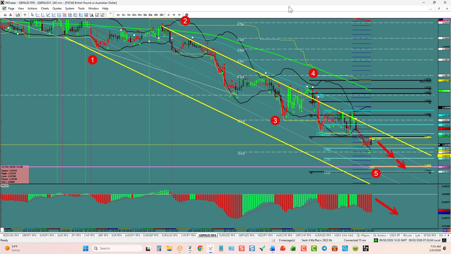 Forex Strategy is Bearish: We are currently @ 1.9348 in a 5th wave. We are looking for a continuation to the ATR Target\Day chart bottom @ 1.9200 area. The overall target is the1.618 Fibo @ 1.9169 area. We have convergence on the hourly. USDX is currently down. Watch the USDX for direction. The average daily true range (ATR) for the pair currently is 191 pips per day and it’s 90-day average is 181 pips per day.