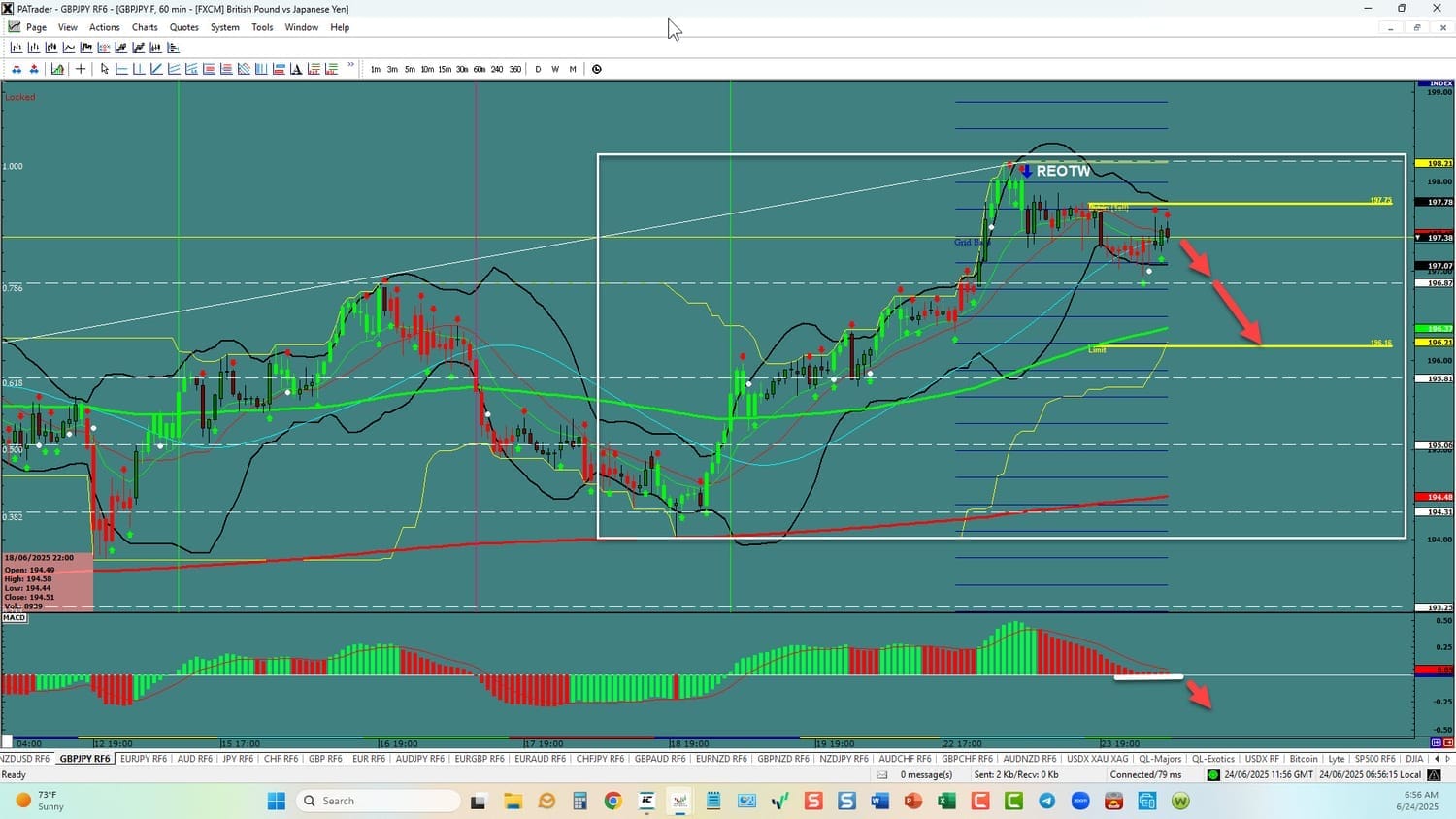 Forex Strategy is Bearish: We are currently @ 197.38. If we break the zero line on MACD, we are looking for a continuation to the ATR target @ 196.21 area today. A further target is the 0.618 Fibo Support @ 195.81 area. This would also start our swing trade this week (Target is 192.00). USDX is currently down. Watch the USDX for direction. The average daily true range (ATR) for the pair currently is 159 pips per day and it’s 90-day average is 192 pips per day.
