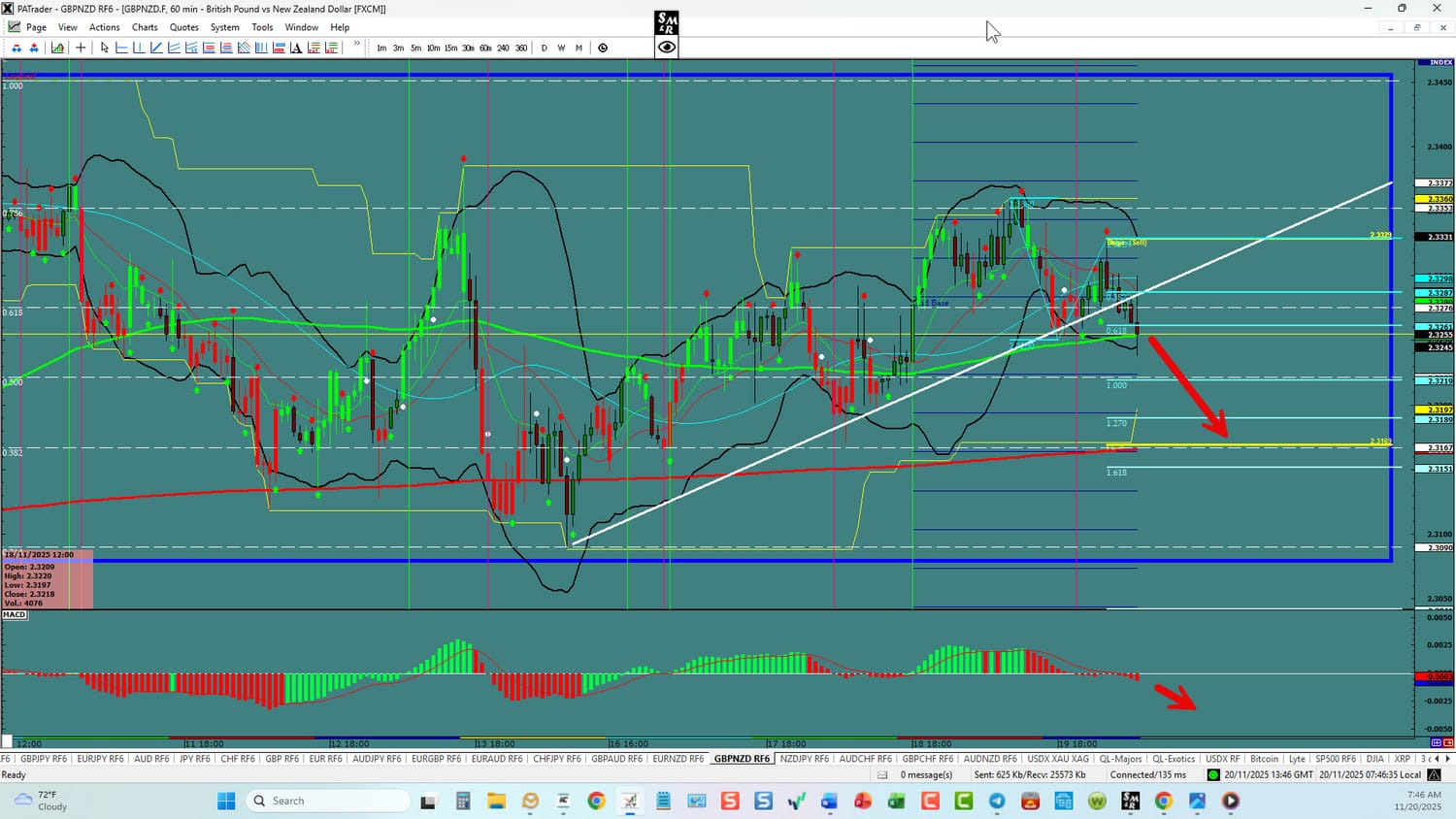 Forex Strategy is Bullish: We are currently @ 2.3255 after slope support break. We are looking for a continuation to the ATR Target @ 2.3167 area with a further target the 1.618 Fibo @ 2.3151. We have convergence on the hourlies. USDX is currently up but at a top. Watch the USDX for direction. The average daily true range (ATR) for the pair currently is 160 pips per day and it’s 90-day average is 139 pips per day.