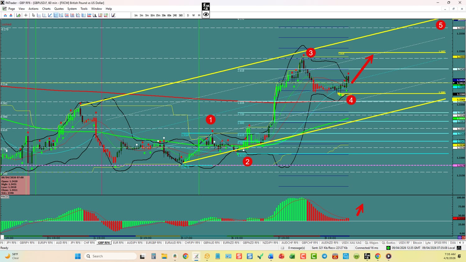 Forex Strategy is Bullish: We are currently @ 1.3411 in a channel and the start of a 5th wave. We are looking for a small pullback and then to continue to the ATR target @ 1.3497 area. The 5th wave target is 1.3566. We have convergence on the hourly. USDX is currently down. Watch the USDX for direction. The average daily true range (ATR) for the pair currently is 95 pips per day and it’s 90-day average is 89 pips per day.