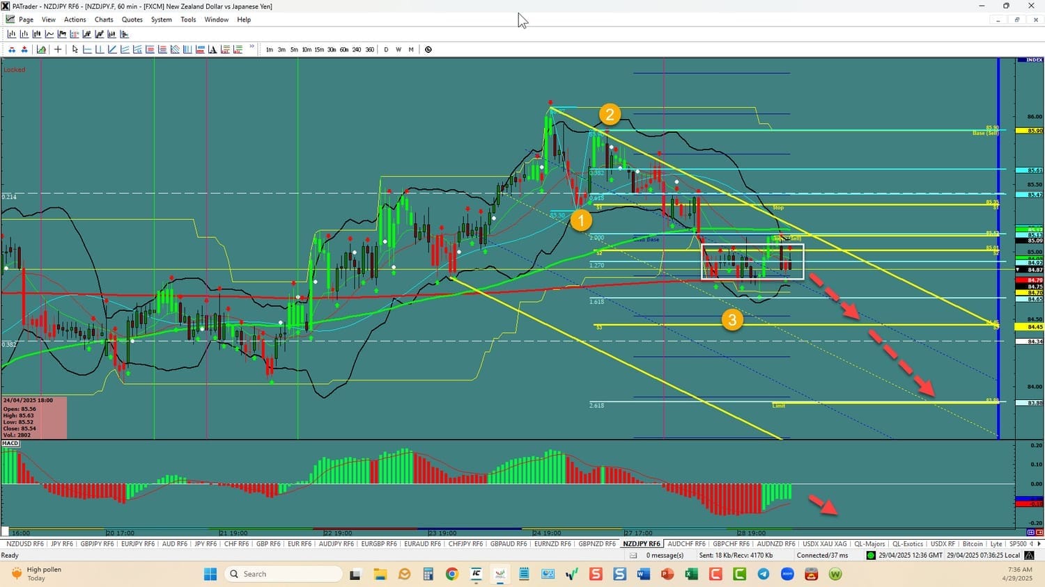Forex Strategy is Bearish: We are currently @ 84.87 in a rectangle pattern and a third wave. If we can break support here, we are looking to continue to the ATR target @ 83.88 area. We have confluence here with the ATR and the 2.618 Fibo. USDX is currently up. Watch the USDX for direction. The average daily true range (ATR) for the pair currently is 124 pips per day and it’s 90-day average is 107 pips per day.