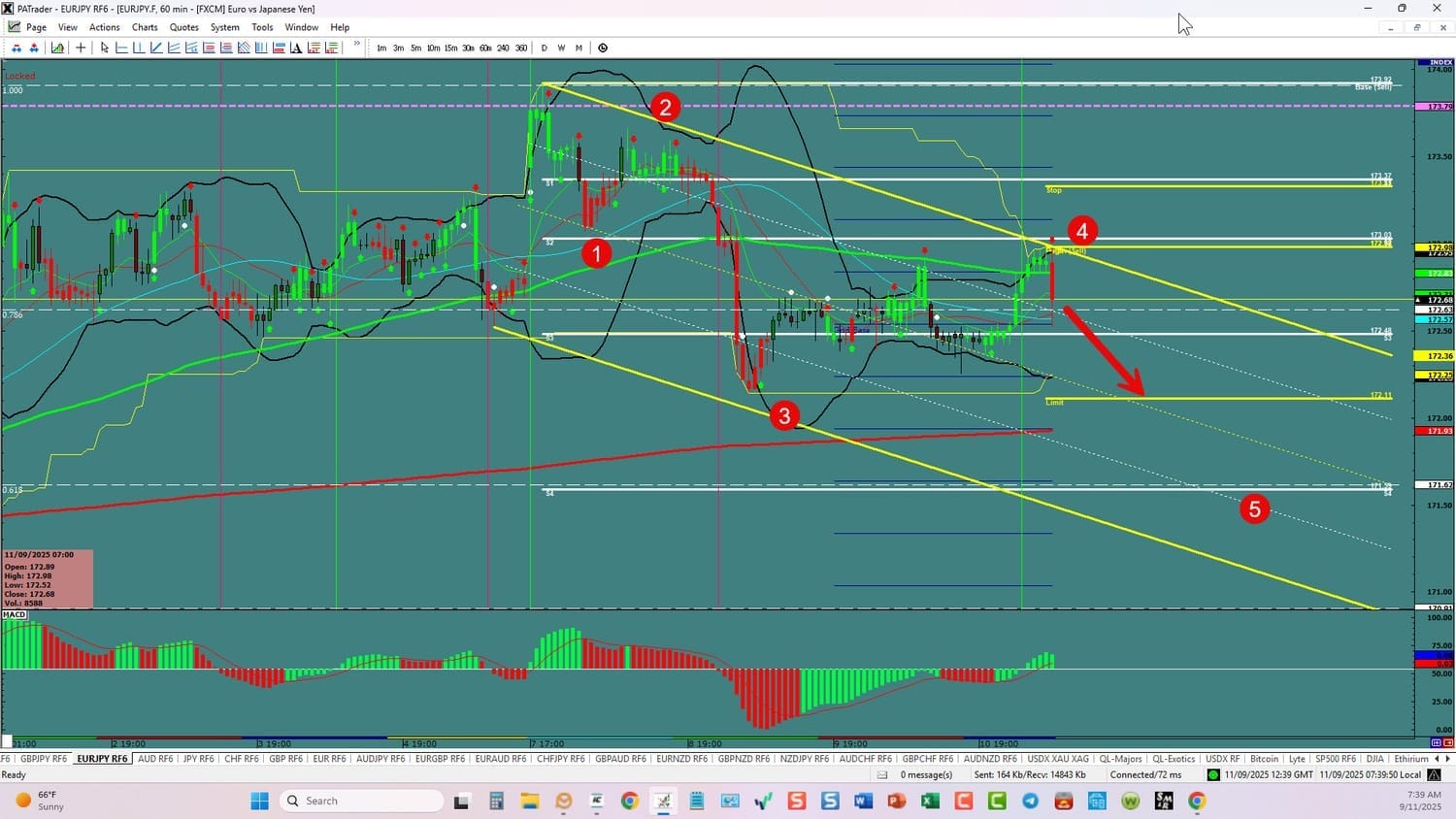 Forex Strategy Bearish: We are currently @ 172.68 in a 5th wave. We are looking for a continuation to the ATR target @ 172.11 area with a further target the S4 171.60. USDX is currently down. Watch the USDX for direction. The average daily true range (ATR) for the pair currently is 87 pips per day and it’s 90-day average is 113 pips per day.